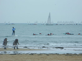 Niñas jugando, practica de la vela y el surf en la playa de San Lorenzo de Gijón